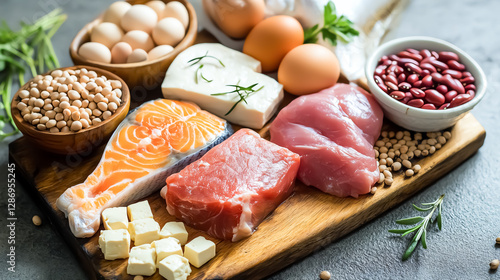 Closeup of lean meats, fish, tofu, eggs, and legumes arranged on a wooden board, highprotein diet, fresh and organic, bright and clean aesthetic