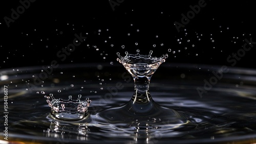Close-up of liquid droplets creating circular waves with a dark background and an abstract composition that looks photorealistic.
