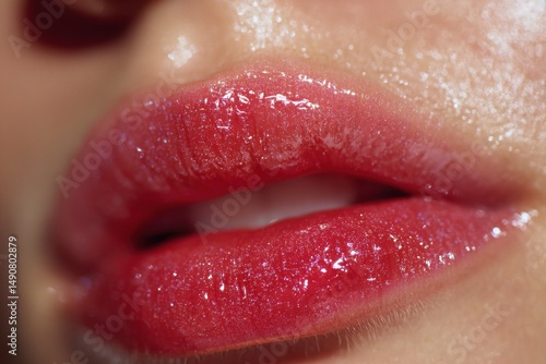 Close-up of luscious red lips with glossy makeup, perfectly capturing the beauty and allure of a confident, radiant smile with a touch of elegance.