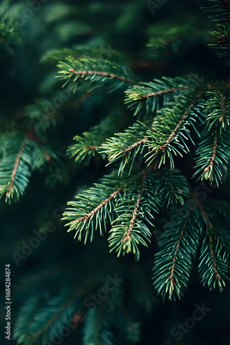 Close-up of lush green evergreen branches with delicate needles, creating a serene and tranquil atmosphere in nature.