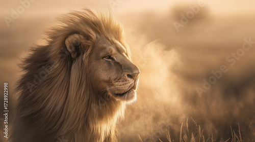 Closeup of majestic lion bathed in golden dawn light, standing proud on the savanna