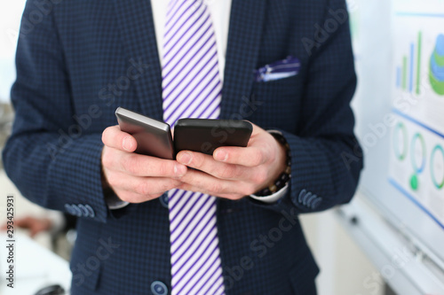 Close-up of manager using modern gadgets and wearing trendy suit with striped tie and classy shirt. Man posing in modern office. Company meeting concept