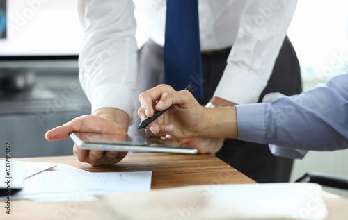 Close-up of manger and customer speaking about condition of agreement. Client signing electronic documents on modern tablet. Business and company concept