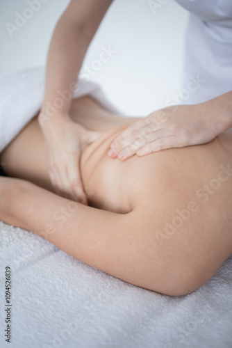 Close-up of masseur's hands on back. close-up masseur hands doing back massage in spa salon. Beauty treatment concept.