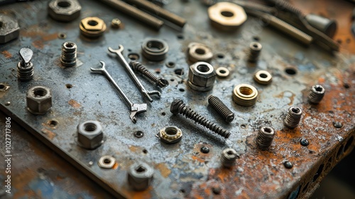 metal, sheet, fastener, tool, nut, bolt, screw, detail, workshop, closeup, hardware, equipment, texture, industry, craft, machinery, repair, bricolage, assembly, table, construct, metallic, mechanic, wrench, surface, design, precision, functional, material, steel, iron, workspace, arrangement, object, artisanship, collection, random, system, layout, item, sheen, shiny, component