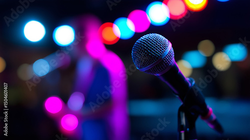Close-up of microphone on stage with colorful concert lights and blurry performer in background.