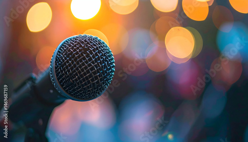 microphone, music, concert, performance, stage, audio, sound, lighting, bokeh, light, dark, background, event, show, entertainment, closeup, detail, equipment, technology, instrument, singing, speaking, vocal, recording, broadcast, studio, party, celebration, night, blurred, warm, orange, purple, black, metal, shiny, sharpened, depth, of, field, abstract, texture, spotlight, atmosphere, vibe, professional, artistic, photo, image