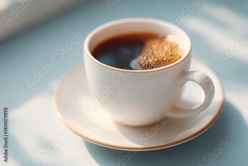 close-up of minimalistic cafe table setting with single steaming cup of coffee surrounded by clean lines and modern