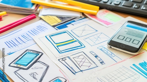 Close-up of mobile app wireframes drawn on a notebook, with smartphone and UI design sketches on desk.