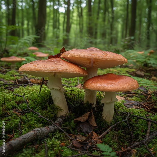 Close-up of mushrooms with caps in a forest environment with green moss and trees