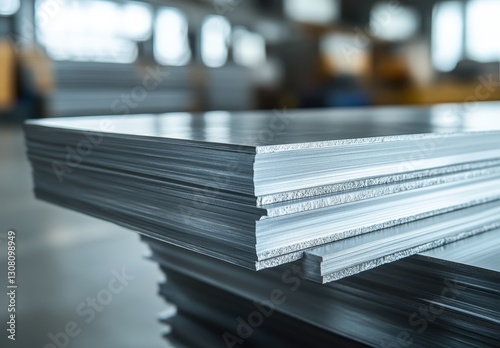 Close-Up of Neatly Stacked Metal Sheets in Industrial Warehouse with Natural Lighting and Soft Focus Background