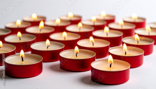 Close-up of numerous red-cased tea lights burning brightly against a white backdrop