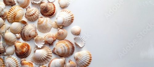 Close-up of numerous seashells on a white backdrop, with ample copy space image.
