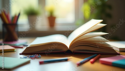 Close-up of Open Textbook with Pages Flipping Mid-Air Surrounded by Colorful Stationery on Wooden Study Desk in Natural Sunlight