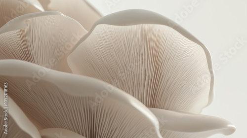 Close-Up of Oyster Mushrooms on White Background: A cluster of fresh oyster mushrooms with delicate gills on a simple white background.