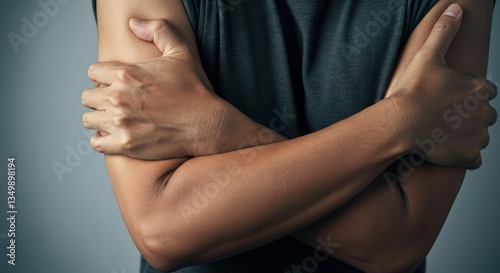 crossed, arm, confidence, close, up, person, self, assurance, assertiveness, posture, body, language, arm, cropped, skin, folded, expression, gesture, torso, human, strength, reassurance, security, comfort, empowerment, identity, casual attire, serious, nonverbal, hand, elbow, neutral, muscle, determination, stance, position, adult, dark, background, indoor, sleeve, confrontation, pose, reaction, single, individual