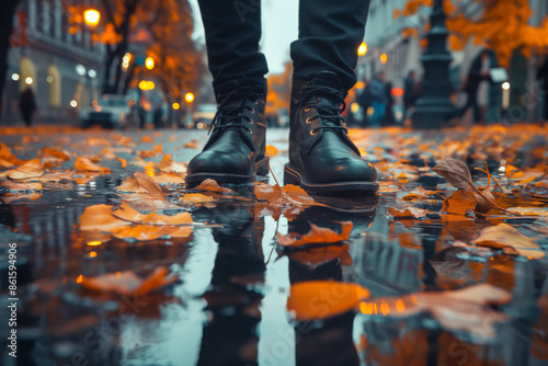 shoe, man, leg, black, walking, wet, autumn, city, street, fashion, seasonal, closeup, leaf, pavement, sidewalk, footwear, stylish, urban, lifestyle, puddle, fall, weather, evening, commute, casual attire, trendy, modern, pedestrian, outfit, night, scene, light, metropolitan, season, rain, travel, boot, boot