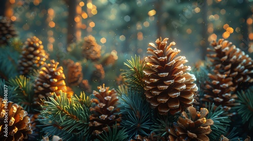 Close-up of pine cones on branches in a forest, sunlight filtering through trees. Nature and tranquility concept