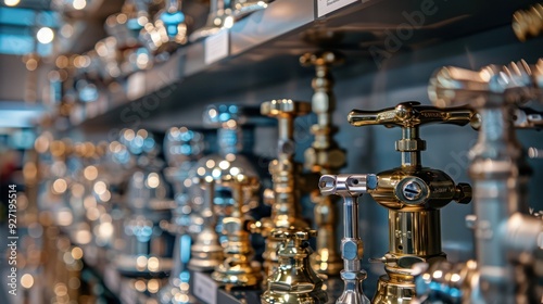 Close-up of plumbing pipes and fittings displayed in a showroom.