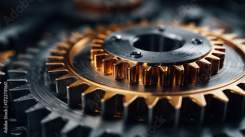 Close-up of polished mechanical gear system