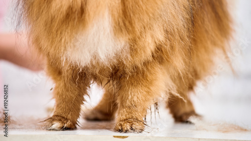Closeup of pomeranian paws. Closeup of dirty pomeranian paws and fur needing professional treatment