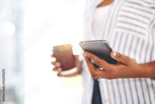 Closeup of professional business woman on her phone working and replying to messages, emails or social media with flare. Black female businessperson holding work and personal cellphone in her office