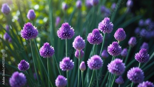 Close-Up of Purple Chive Blossoms: Gorgeous Floral Background in Summer Garden