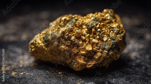 Close-up of raw gold nugget on dark background, showing metallic luster and granular texture