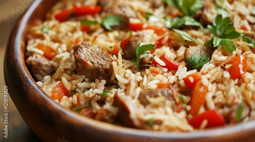 Close-up of rice and Turkish pilaf with lamb and vegetables in a traditional Turkish serving dish, emphasizing savory and rich qualities. Ideal for Turkish cuisine and festive meals.