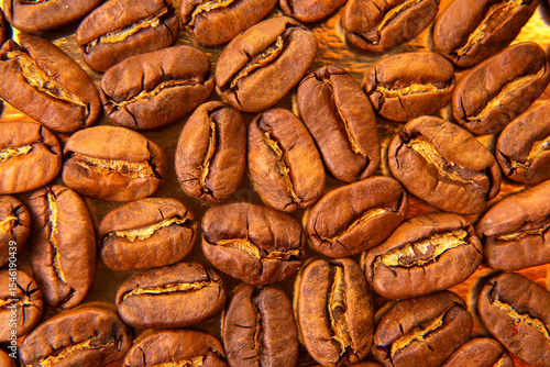 Close-up of roasted coffee beans on a lustrous golden tray, showcasing their deep brown color and intricate textures.
