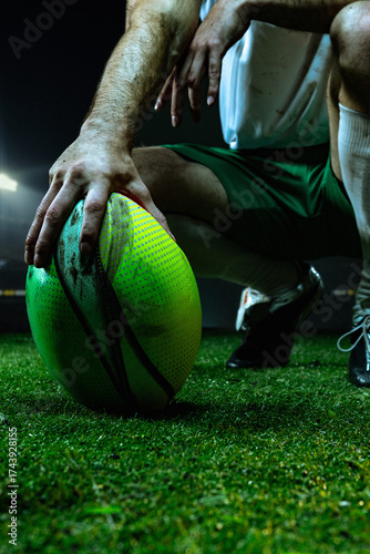 Close-up of rugby player placing green ball on wet grass before match start. Concept of branding and digital marketing for sports campaigns, fitness visuals, and team promotion.