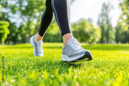 Close-up of running shoes on grass, a person jogging in a park, enjoying sunny morning workout.