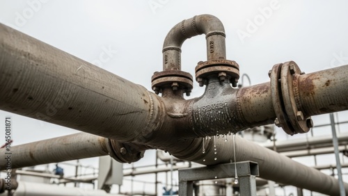 operation, droplet, detail, facility, system, plumbing, network, utility, pipe, framework, mechanical, supply, distribution, manufacturing, pipeline, heavy, valva, process, leak, machinery, production, weathered, connection, installation, complex, grid, industry, overcast, structure, grey, infrastructure, engineering, factory, industrial, steel, transport, sky, metal, rust-eaten, iron, corrosion, flange, equipment, water, construction, plant, closeup, oxidized, modern