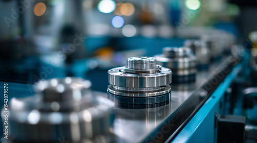 Closeup of samarium-cobalt magnets on assembly line, metallic surfaces polished to perfection, emphasizing industrial application, rare earth manufacturing, with copy space