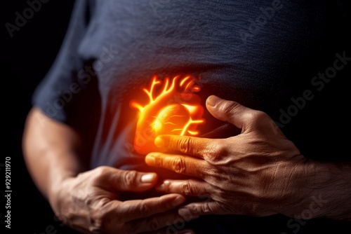 Close-up of Senior Man Clutching Chest with Glowing Heart Overlay, Depicting Heart Attack Symptoms.