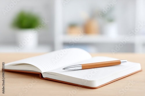 closeup, serene, work, desk, minimalist, open, notebook, pen, career, coaching, inspiration, simplicity, sharpened, surrounding, area, uncluttered, enhance, calmness, ample, copy space, text, neutral, tone, create, clean, image, professionalism, clarity, development, theme, visual, colours, style, texture