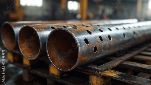 Close-up of several steel pipes with holes stacked on a wooden pallet in a factory.