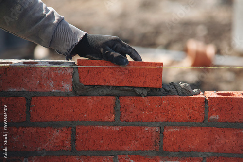 Close-up of skilled bricklayer working on construction site laying bricks for wall construction