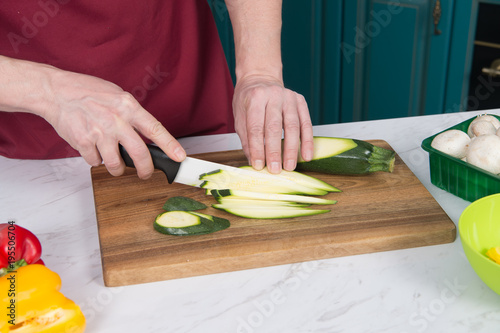 Closeup of sliced zucchini on table. Close up of hands slicing green vegetable with white knife. Closeup of men cutting green zucchini on wooden board