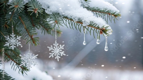 Close-up of snow-covered Christmas tree branches with delicate snowflakes and sparkling icicles, green, snowy, icicles, frosty