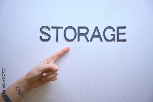 Close-up of storage signature, female hand pointing