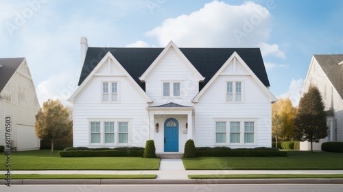Close-Up of Stylish Suburban Home with Brick and Siding Architecture, Shingle Roof and Elegant Window Design.