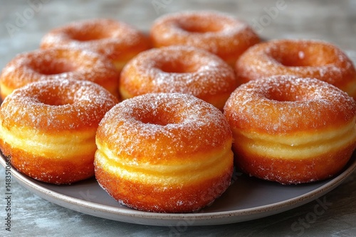 Close-up of sugared donuts on a gray plate, delicious dessert. Use it for baking blogs, menus, or pastry shop advertisements.