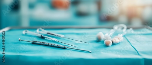 Close-up of surgical instruments on a sterile table ready for medical procedures in a modern health care environment.
