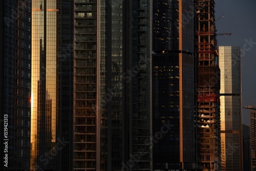skyscraper, building, urban, city, construction, sunset, modern, glasses, architecture, tower block, steel, window, structure, evening, light, shadow, development, city landscape, tower, downtown, metropolitan, industry, crane, worksite, urbanisation, skyline, urban life, real estate, sun, exterior, commercial, office, residential, growth, progress, modernity, technology, business district, dusk, construction site, urban development, tall building, industrial
