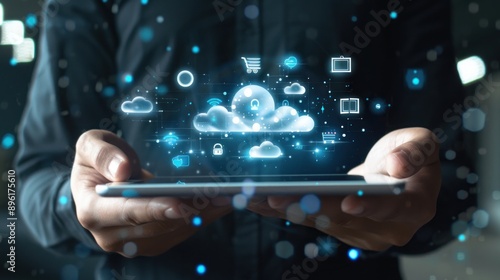 Close-up of the hand of a businessman using a tablet or smartphone with cloud computing, Computer system resources, and data storage, Cloud service technologies concept.
