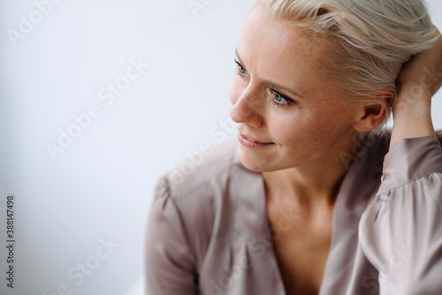 closeup, thoughtful, businesswoman, hand, hair, white, wall, office, smiling, copy space, 1, people, adult, business, woman, young, occupation, job, head shot, pensive, daydreaming, dreaming, mid, female, blond, contemplation, caucasian, looking, short, entrepreneur, colours