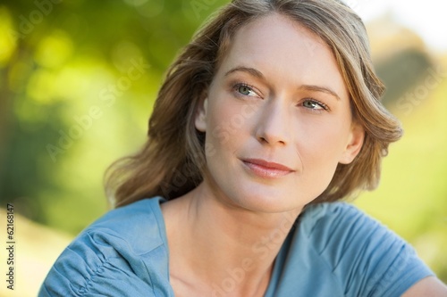 young adult, woman, female, caucasian, lifestyle, leisure, casual attire, pretty, beautiful, park, parkland, fair hair, blond, light hair, face, smiling, content, thoughtful, thinking, daydreaming, sitting, relaxation, outdoors, closeup, looking away