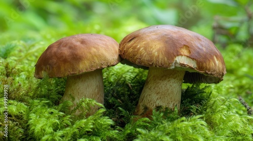 Close-up of Two Brown Mushrooms Growing on Mossy Forest Floor in Natural Outdoor Setting