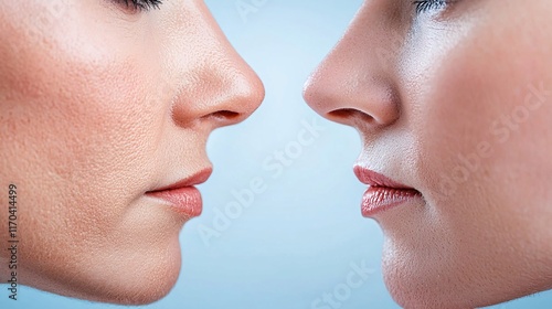 Close-up of two faces in profile, highlighting skin texture and facial features against a soft blue background.